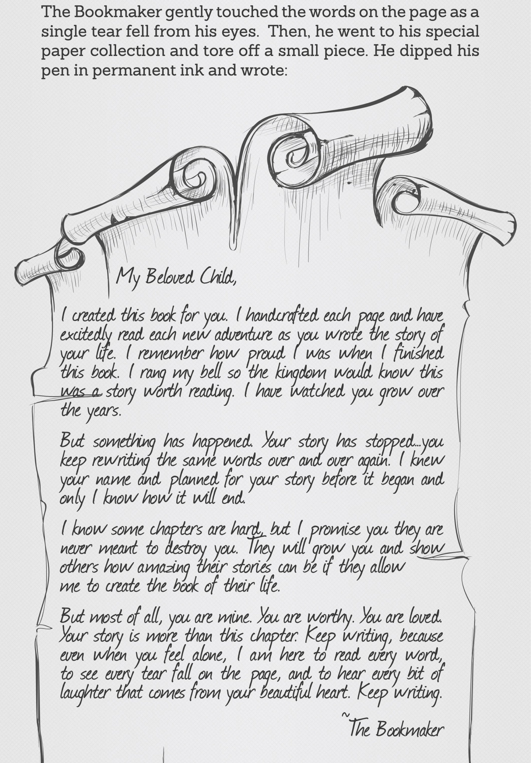 I created this book for you. I handcrafted each page and have excitedly read each new adventure as you wrote the story of your life. I remember how proud I was when I finished this book. I rang my bell so the kingdom would know this was a story worth reading. I have watched you grow over the years. But something has happened. Your story has stopped…you keep rewriting the same words over and over again. I knew your name and planned for your story before it began and only I know how it will end.