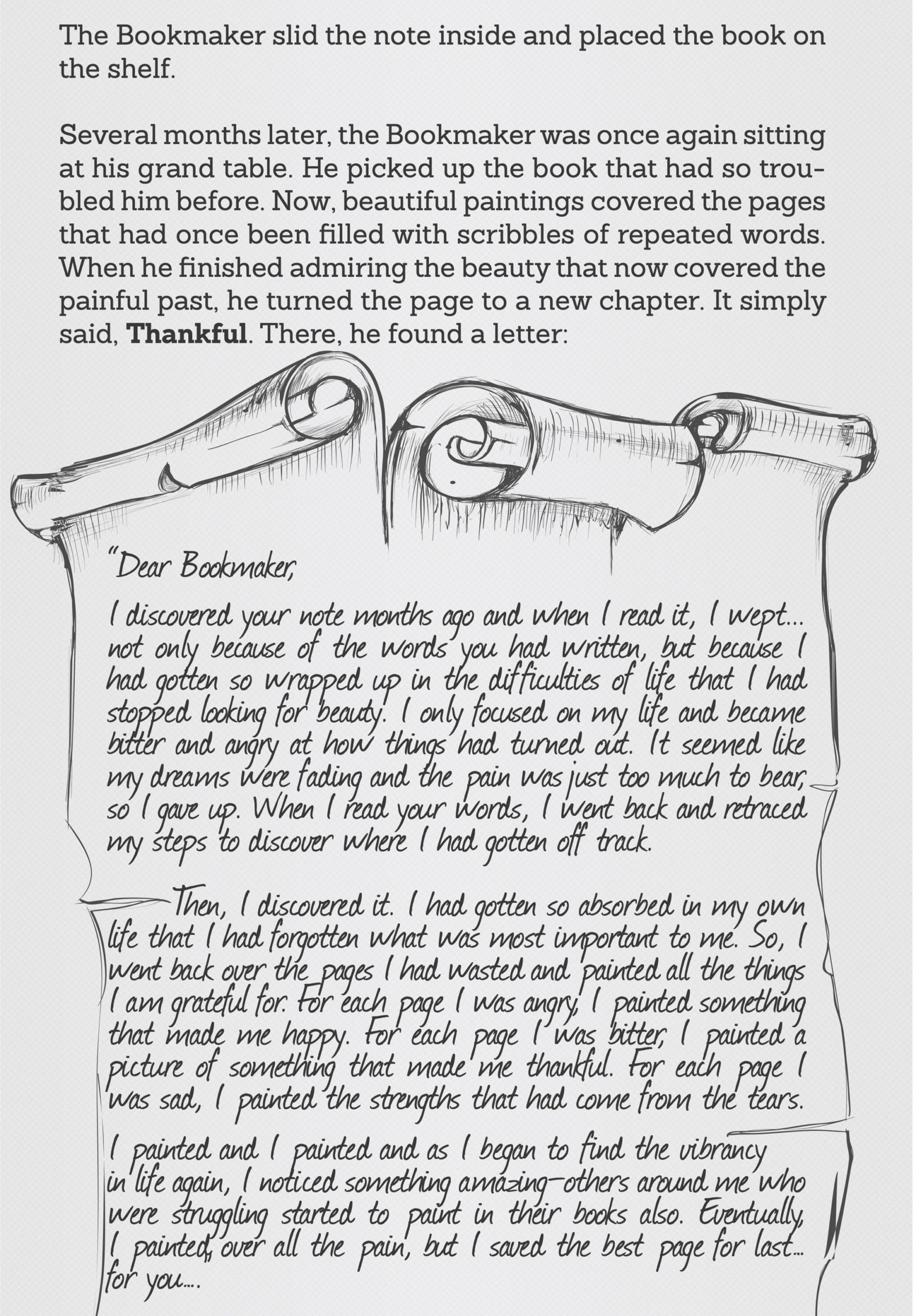 Several months later, the Bookmaker was once again sitting at his grand table. He picked up the book that had so troubled him before. Now, beautiful paintings covered the pages that had once been filled with scribbles of repeated words. When he finished admiring the beauty that now covered the painful past, he turned the page to a new chapter. It simply said, Thankful.