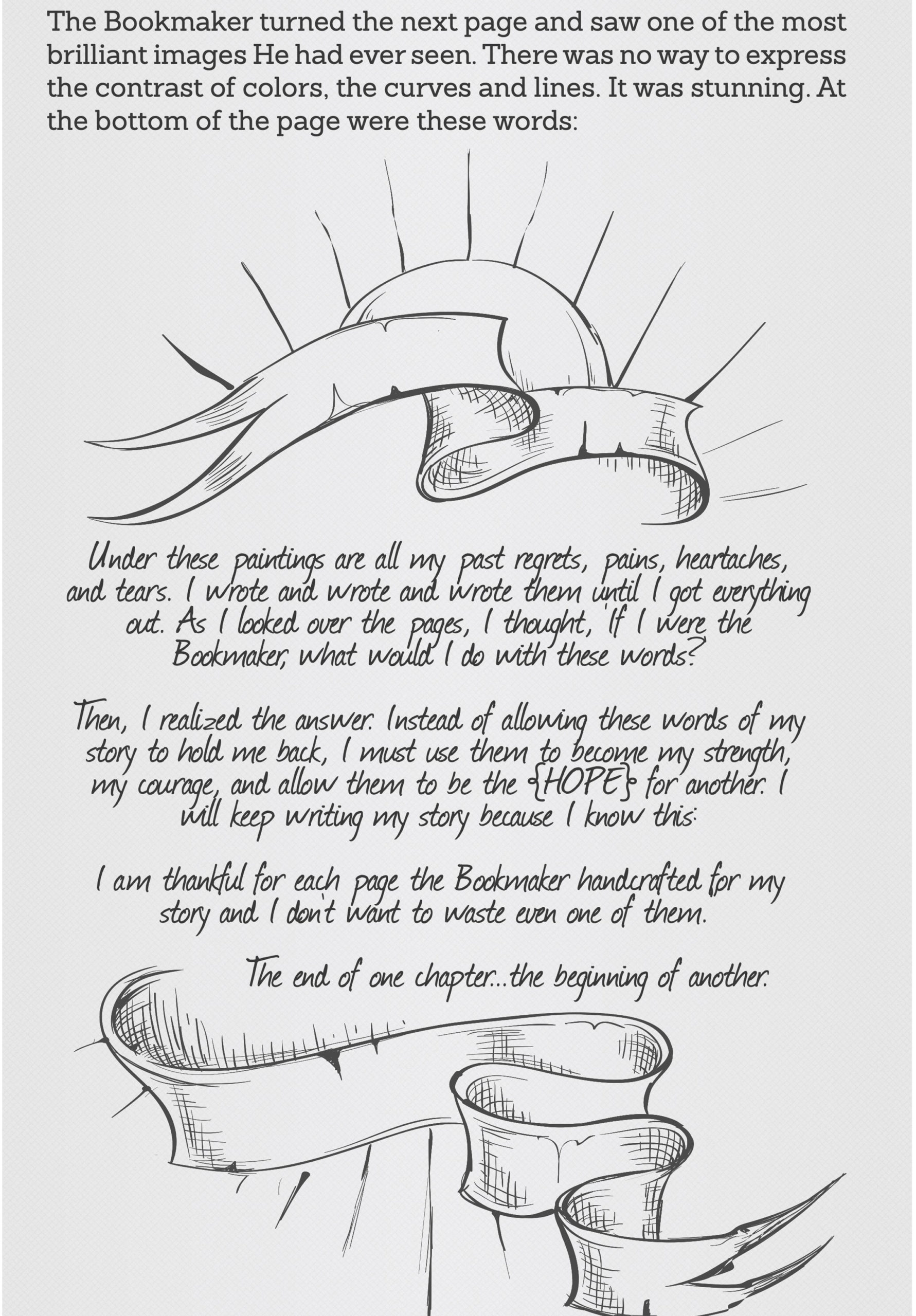 Several months later, the Bookmaker was once again sitting at his grand table. He picked up the book that had so troubled him before. Now, beautiful paintings covered the pages that had once been filled with scribbles of repeated words. When he finished admiring the beauty that now covered the painful past, he turned the page to a new chapter. It simply said, Thankful.